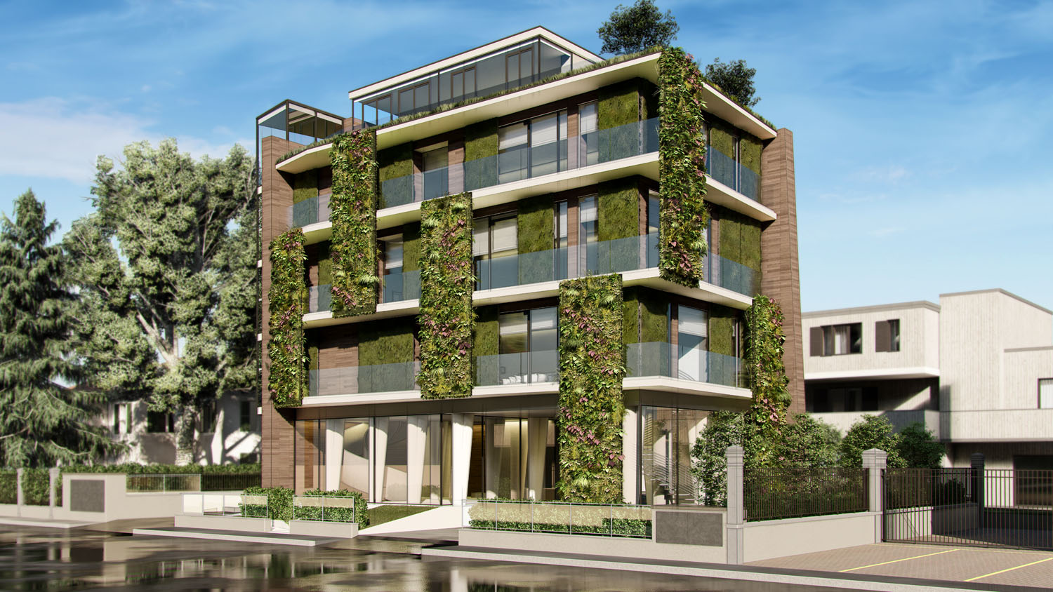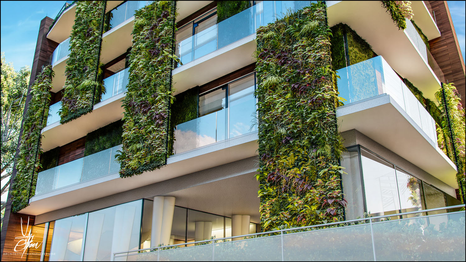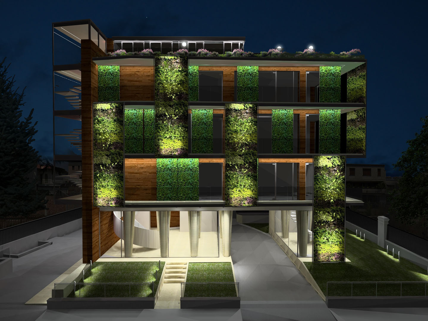 Pannelli mobili verticali di vero verde impreziosiscono la facciata della palazzina.