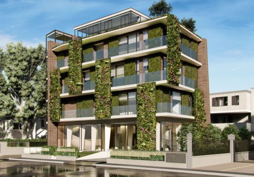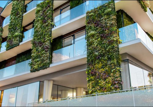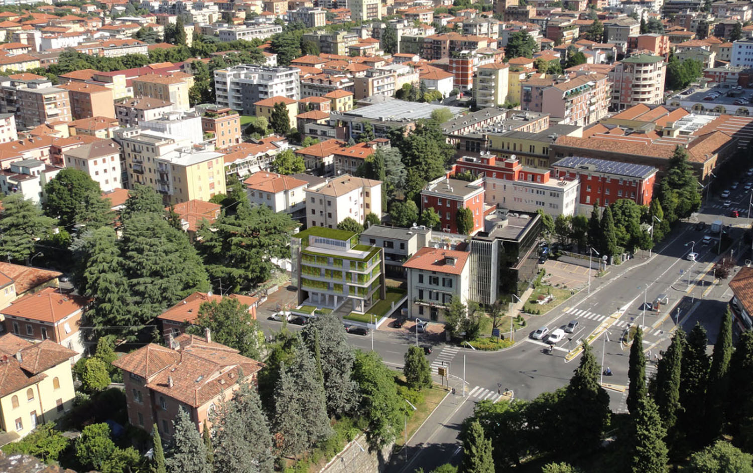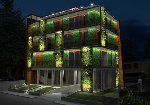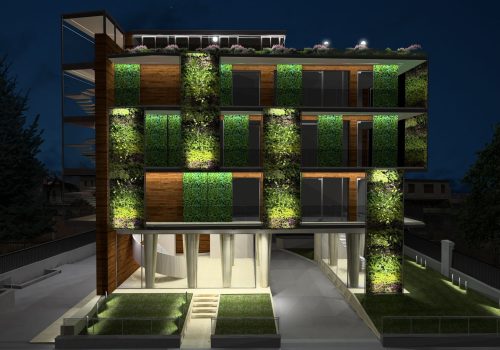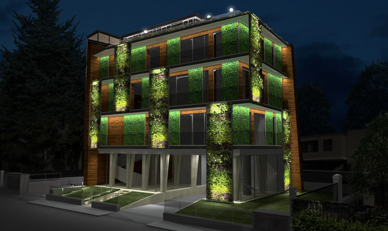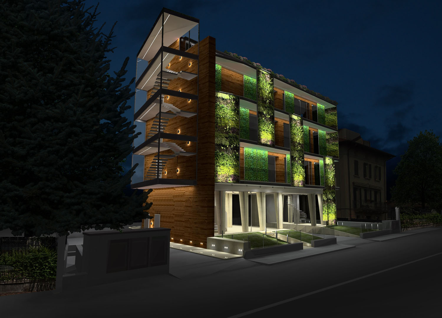 Pannelli mobili verticali di vero verde impreziosiscono la facciata della palazzina.
