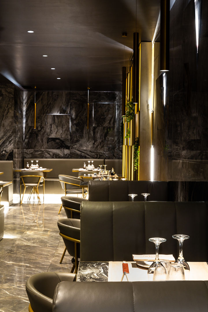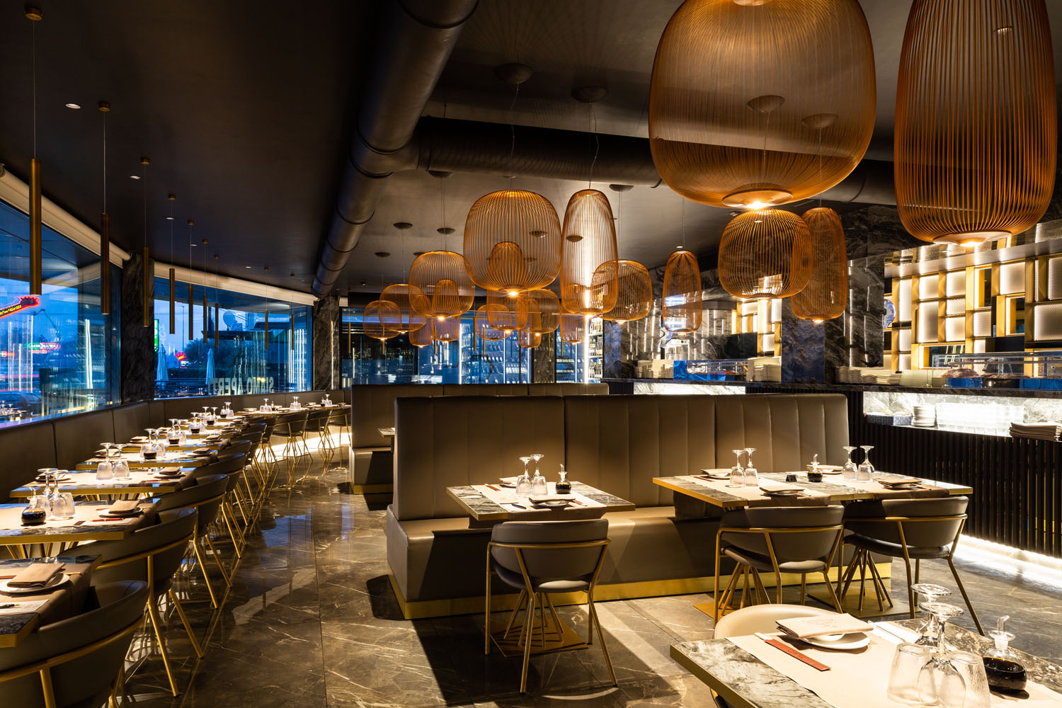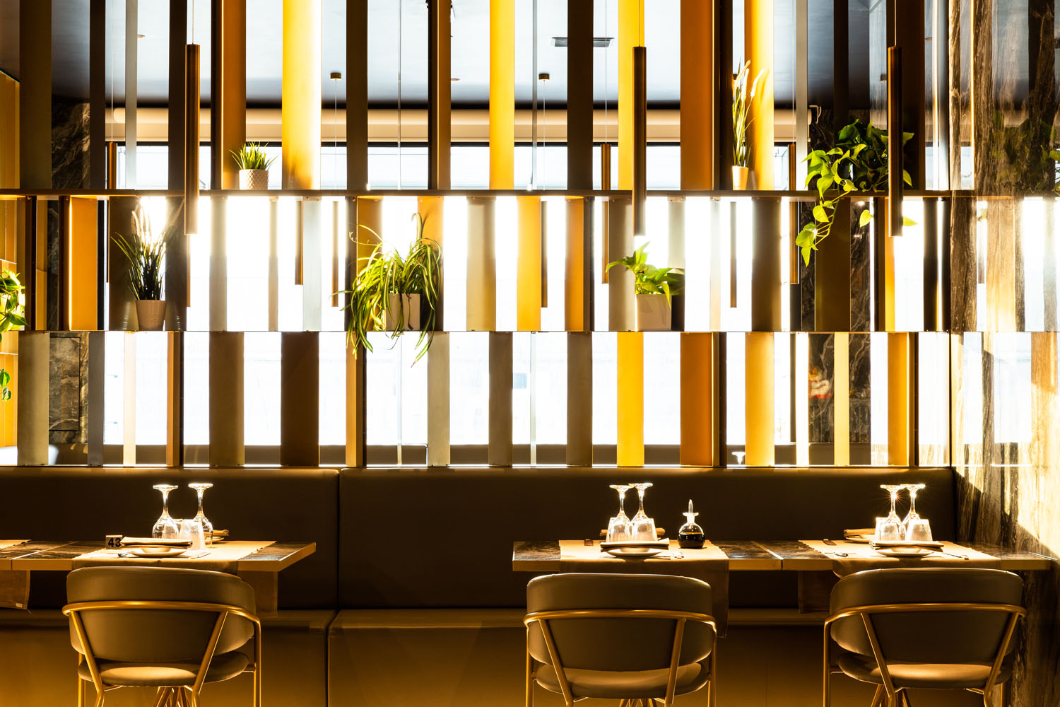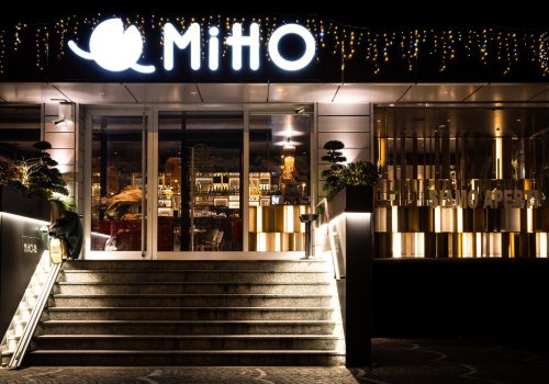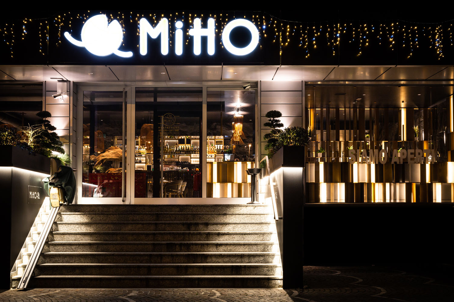Il viaggio all’interno del ristorante Miho è una continua scoperta di sorprendenti forme, eleganti accostamenti cromatici e infiniti effetti ottici generati da luci e ombre che si intersecano.