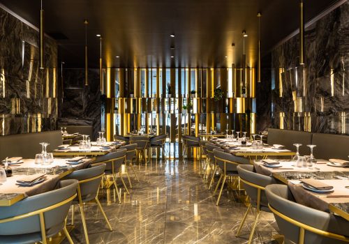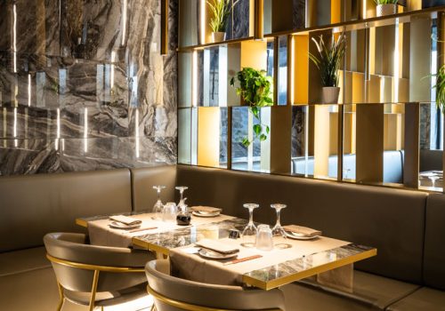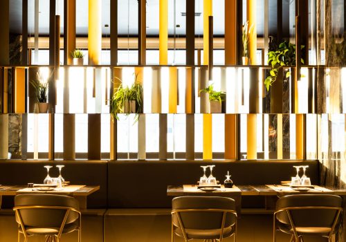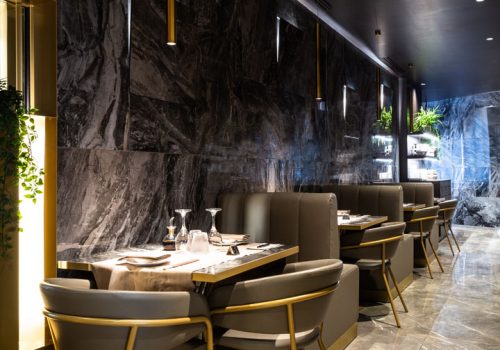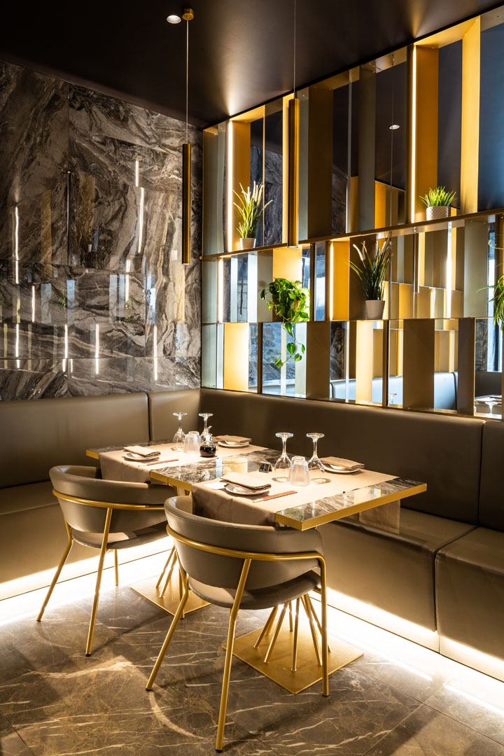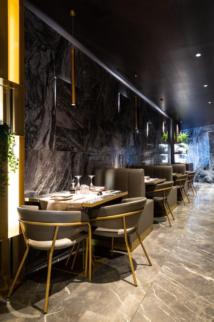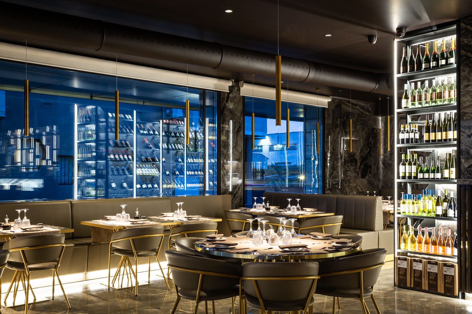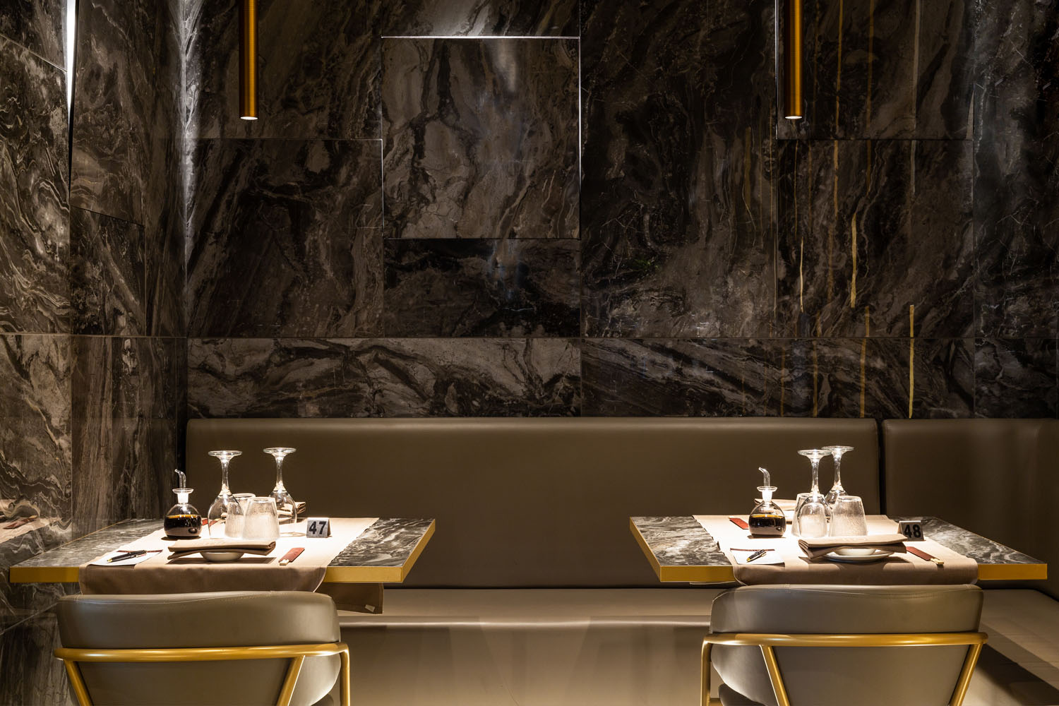 Il viaggio all’interno del ristorante Miho è una continua scoperta di sorprendenti forme, eleganti accostamenti cromatici e infiniti effetti ottici generati da luci e ombre che si intersecano.